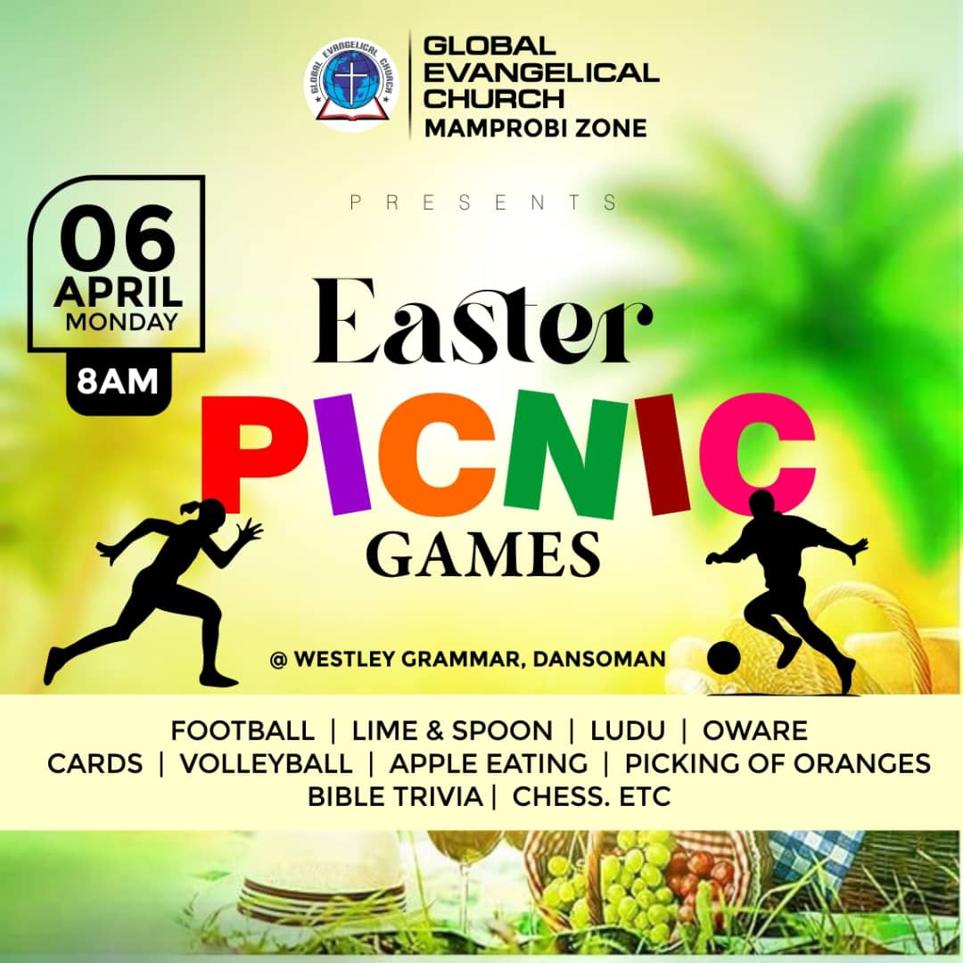As part of our Easter celebrations, the Global Evangelical Church – Mamprobi Zone is organizing a fun-filled Easter Picnic and Games to bring members together in fellowship, unity, and joy as we celebrate the resurrection of our Lord Jesus Christ. The event will take place on Monday, 6th April at 8:00 AM at Wesley Grammar School, Dansoman. There will be exciting games and activities such as football, volleyball, lime and spoon race, ludu, oware, cards, chess, bottle flipping, 100 meters and . All members and friends are warmly invited to come along with their families to enjoy a wonderful time of fellowship, fun, and celebration together. Don’t miss it! Come and be part of this memorable Easter celebration.ened bonds.